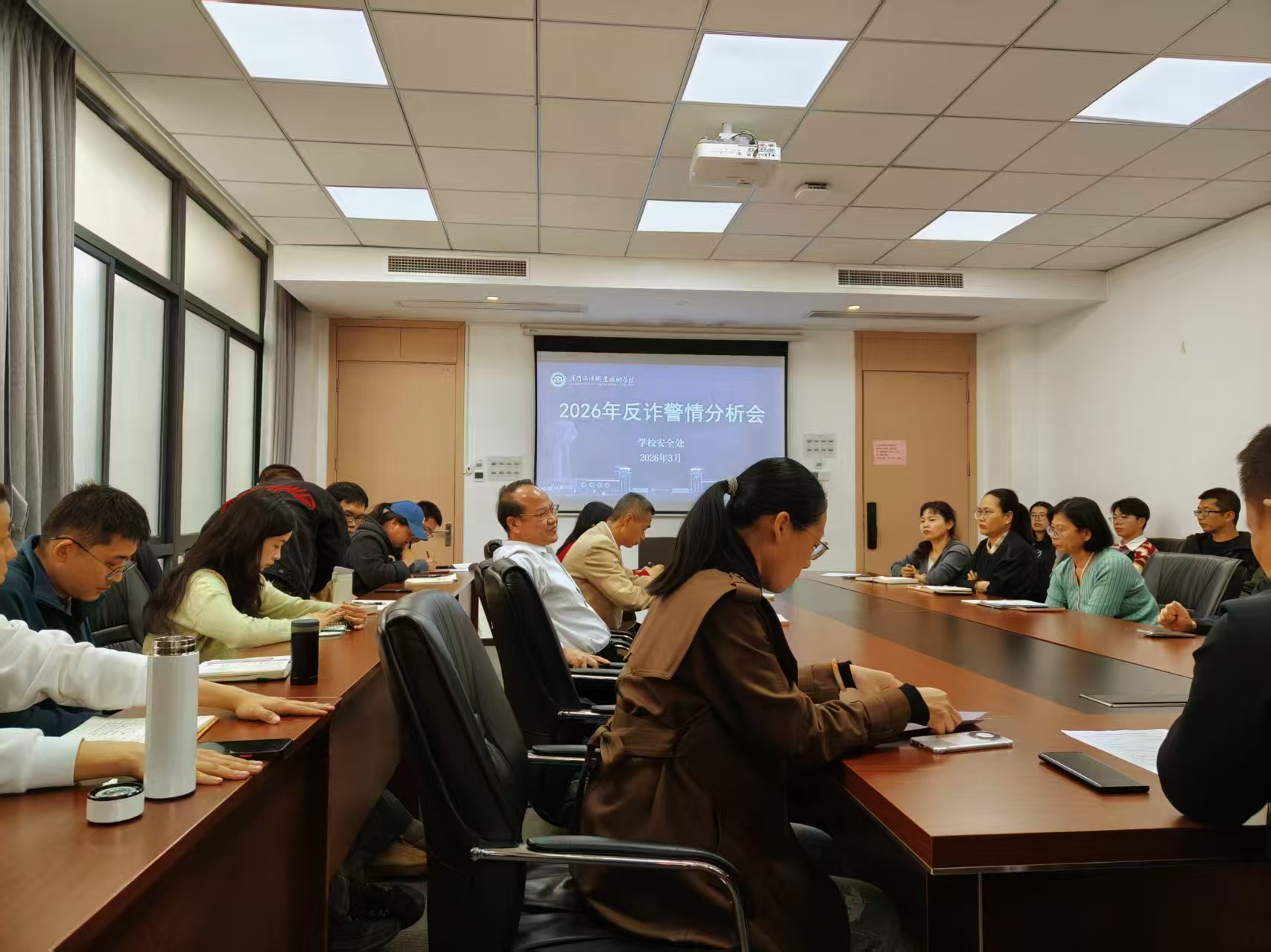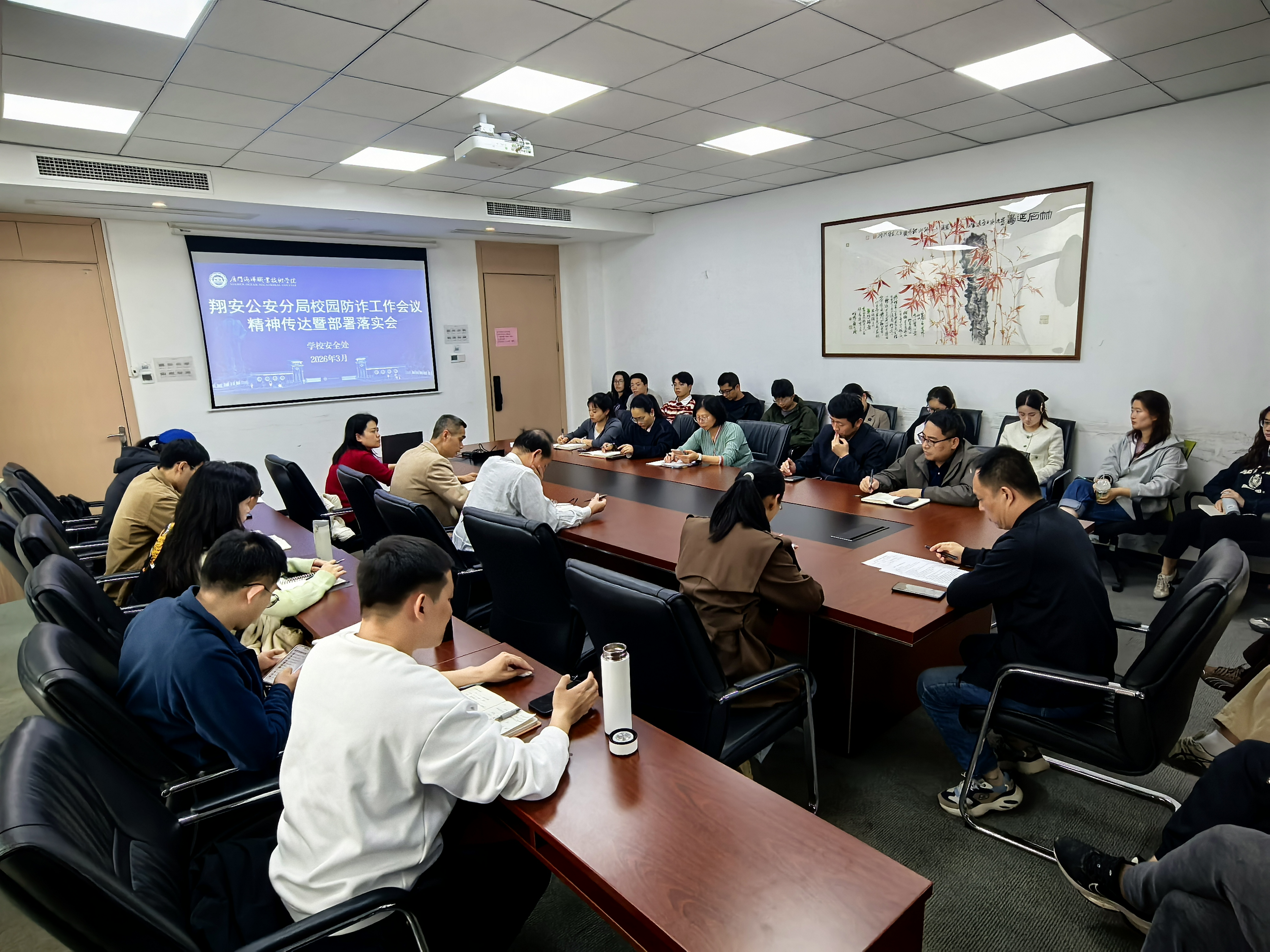2026年3月20日,学校召开新学期反诈专题工作会议。马国玄副校长主持会议并讲话,安全处、学工部工作人员、各二级学院负责学生工作的副书记、全体辅导员参加会议。
