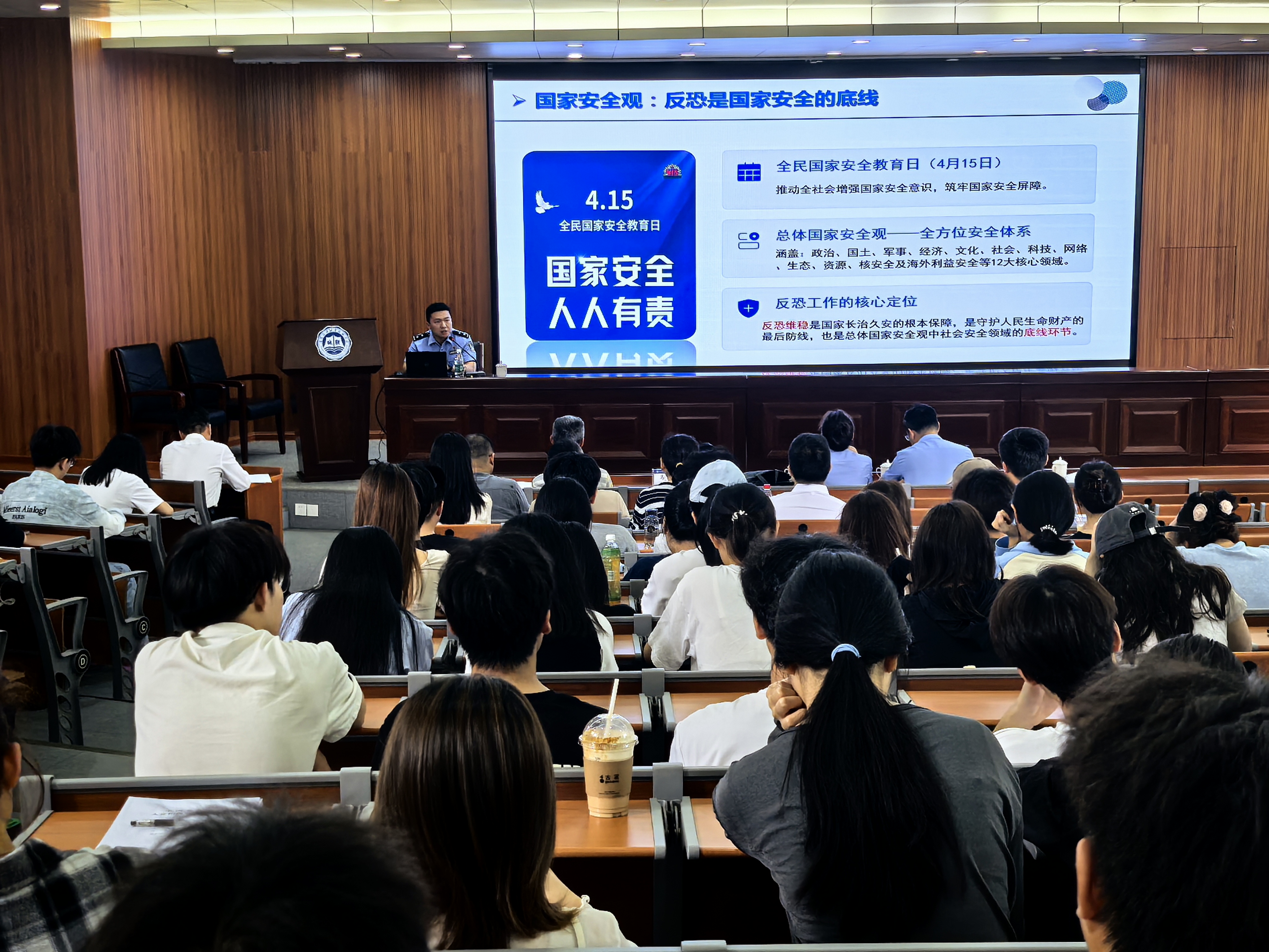 活动特邀厦门市公安局反恐支队赖嗣超警官作题为“筑牢反恐防线,防范宗教渗透,守护校园平安净土”的专题宣讲。赖警官从国家安全教育与反恐工作的内在联系出发,深入剖析当前反恐工作面临的外部形势,系统阐释了我国依法开展去极端化工作的政策实践,并结合校园实际,详细讲解了师生在日常生活学习中应警惕的风险隐患和应遵守的行为规范。市公安局叶思雨警官、翔安分局李永健、王德峰警官出席宣讲会。全校各二级单位安全责任人、安全信息员等200余人参加学习。