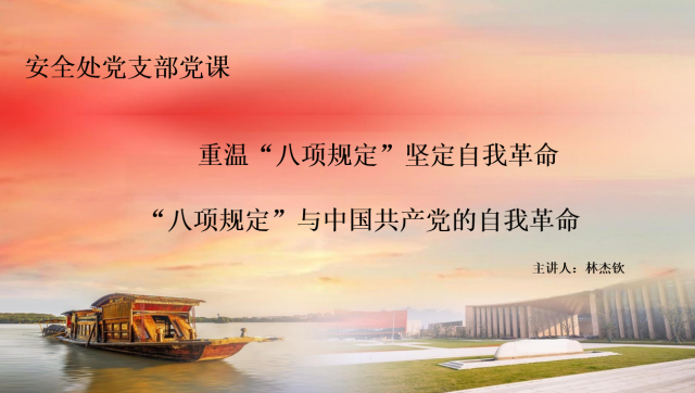 启动部署会结束后,安全处党支部书记林杰钦为全体党员上《重温“八项规定”,坚定自我革命》主题党课,通过讲述“八项规定”是新时代作风建设的战略路标;“八项规定”与新时代自我革命的科学建构;“学查改立”中一体推进学习教育取得成效;锲而不舍落实中央八项规定精神,推动作风建设常态化长效化;从四个方面强调了新时代“八项规定”与中国共产党的自我革命,要求大家要在学习中自查自纠,守住安全底线。