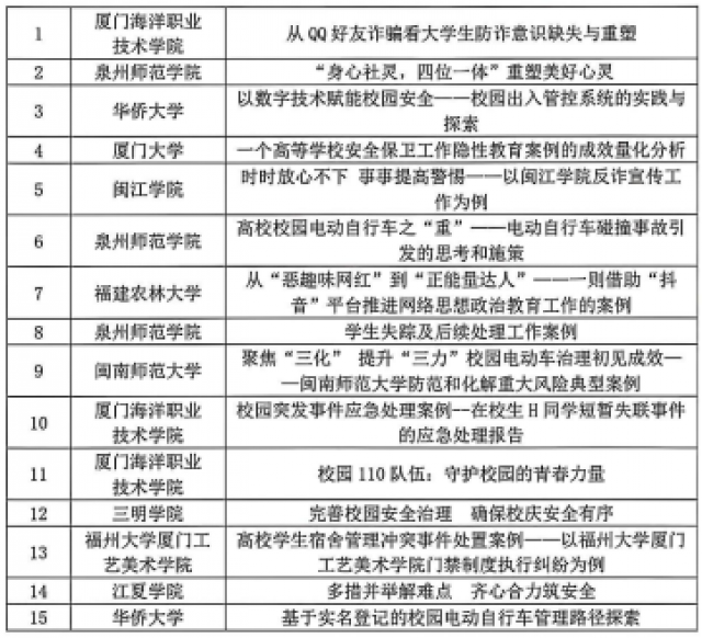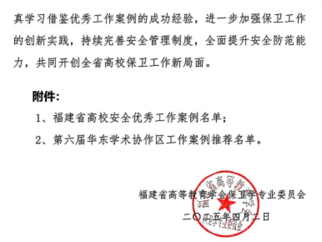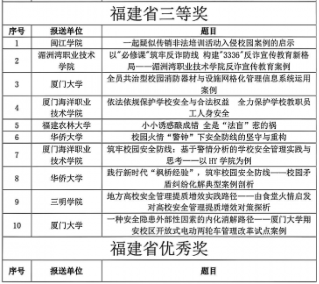 在福建省高等教育学会保卫学专业委员会主办的“第六节华东学术协作区高校安全高峰论坛安全工作案例征集(福建省)”的评选中,我校选送的《依法依规保护学校安全与合法权益、维护学校教职员工人身安全,保护学校教职员工人身安全》《筑牢校园安全防线:基于警情分析的学校安全管理实践与思考》两篇案例荣获福建省高校优秀工作案例三等奖,《从QQ好友诈骗看大学生防诈意识缺失与重塑》《校园突发事件应急处理案例-在校生H同学短暂失联事件的应急处理报告》《校园110队伍:守护校园的青春力量》三篇案例荣获福建省高校优秀工作案例优秀奖。