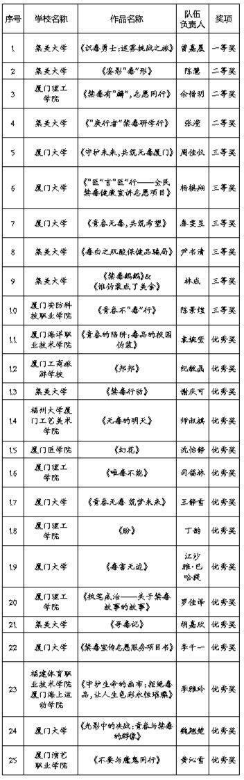 我校通过以赛促学,以学促行,以行促效,激发学生参与禁毒热情,扣好大学生无毒人生“第一粒扣子”,构筑起校园禁毒的“钢铁长城”,并进一步发挥“酵母”作用,利用高校在创新、艺术、传播等领域的智力资源和影响力,探索毒品预防宣教新模式,全力助推厦门争创全国禁毒示范城市。