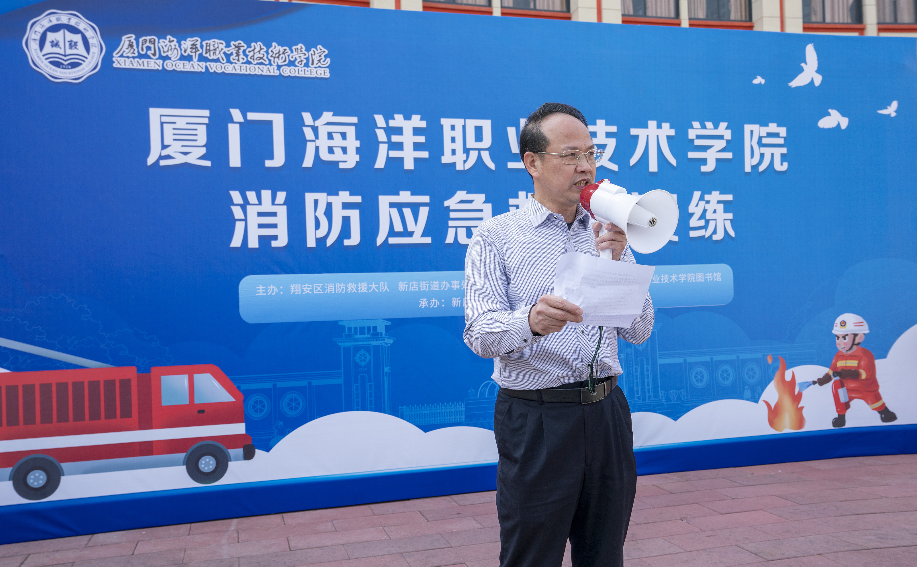 ​​      为提高广大师生消防意识,增强师生应急处置、应急避险和自救互救能力提升学校应急指挥协调能力3月1日,我院在图书馆开展应急救援演练及消防知识技能培训,党委委员、副院长马国玄出席并讲话。翔安区消防救援大队、新店街道专职消防队和东兴社区相关人员应邀到校指导。