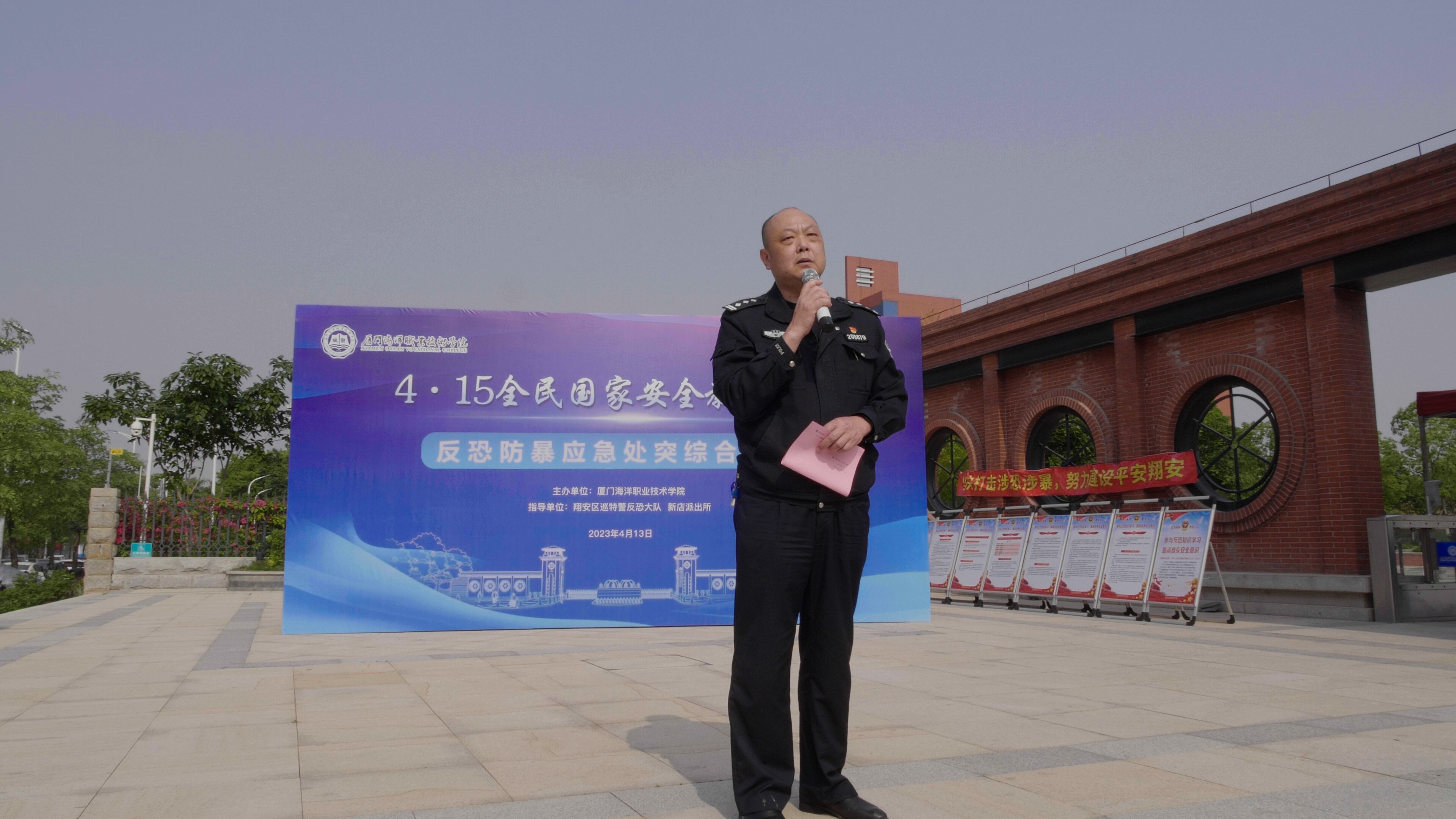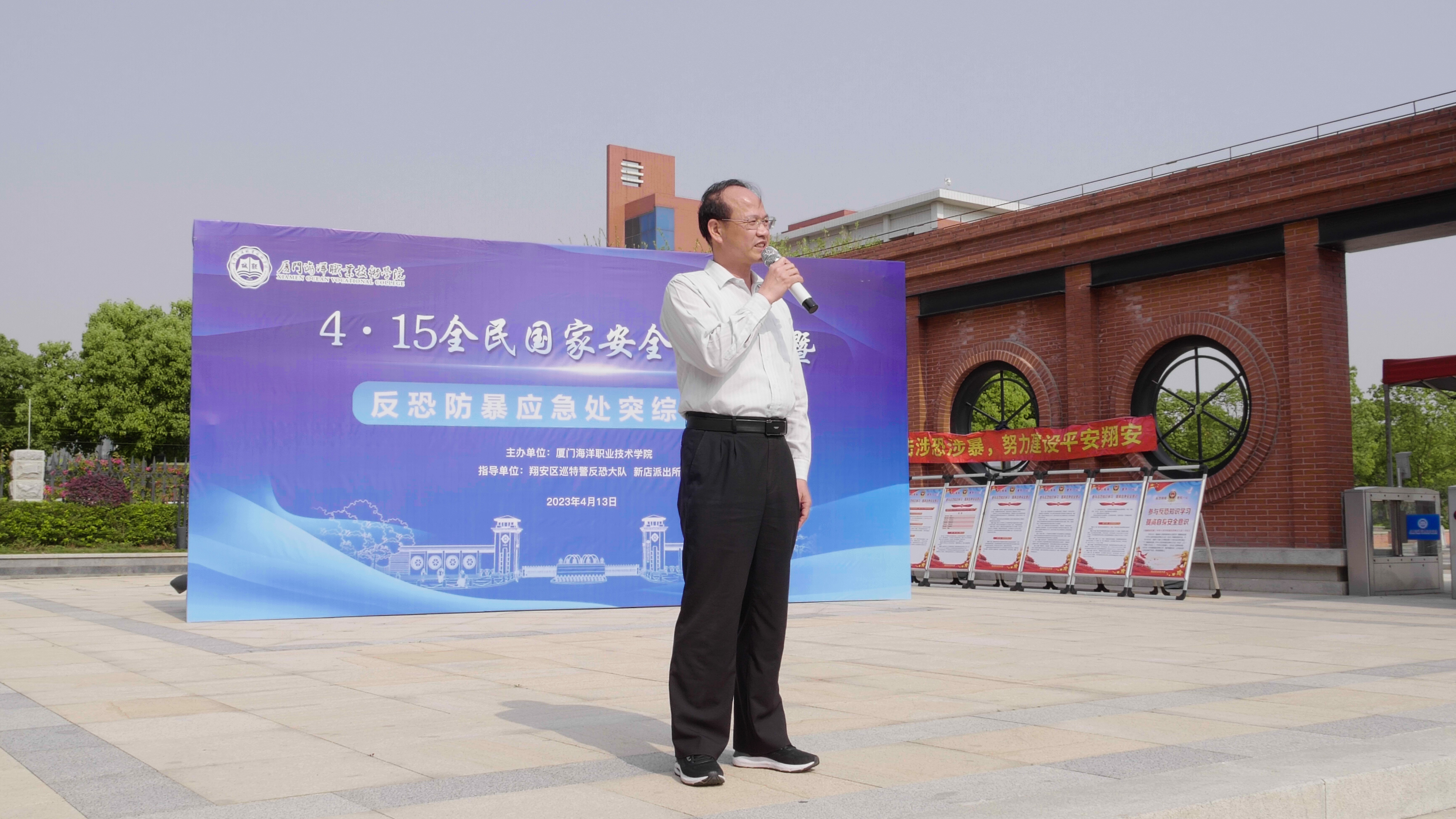 ​​​4月13日下午,我校在翔安校区开展“415全民国家安全教育日”反恐防暴应急处突综合演练。翔安公安分局巡特警反恐大队三级高级警长李安建,新店派出所副所长江龙,学校党委委员、副院长马国玄到场观摩指导。