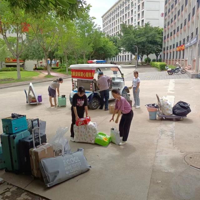 近期,学生结束本学期学习陆续离开校园,由于疫情防控等原因,学校西大门关闭统一从主大门进出,主大门离学生公寓距离较远,家长无法入校为学生拉走行李。杰泰安保服务有限公司驻我校保安员临时做起了搬运工、摆渡员,帮学生搬运行李,维持校园秩序。