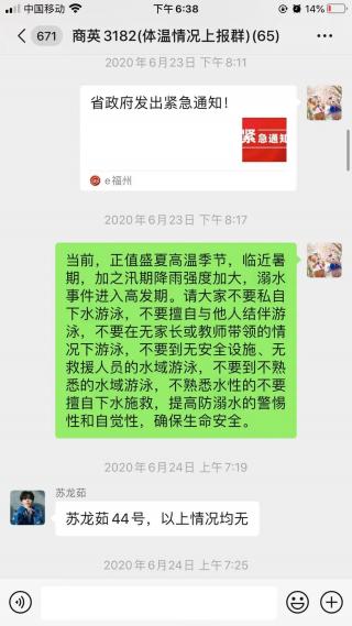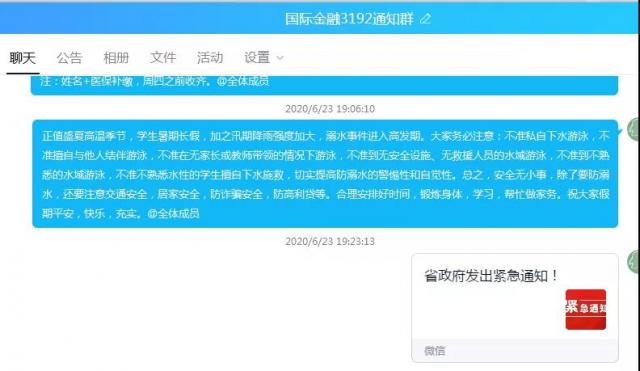 工商系辅导员吕文庭老师通过与班级联络员进行视频聊天,了解班级同学目前安全动态,班级联络员向她报告班级同学目前安全动态,她也详细地通过班级qq 群通知、文件学习、微信公众号相关内容推送、班委特别强调等方式,提醒同学们务必注意:不准私自下水游泳,不准擅自与他人结伴游泳,不准在无家长或教师带领的情况下游泳,不准到无安全设施、无救援人员的水域游泳,不准到不熟悉的水域游泳,不准不熟悉水性的学生擅自下水施救,切实提高防溺水的警惕性和自觉性。安全无小事,除了要防溺水,还要注意交通安全,居家安全,防诈骗安全,防高利贷等。